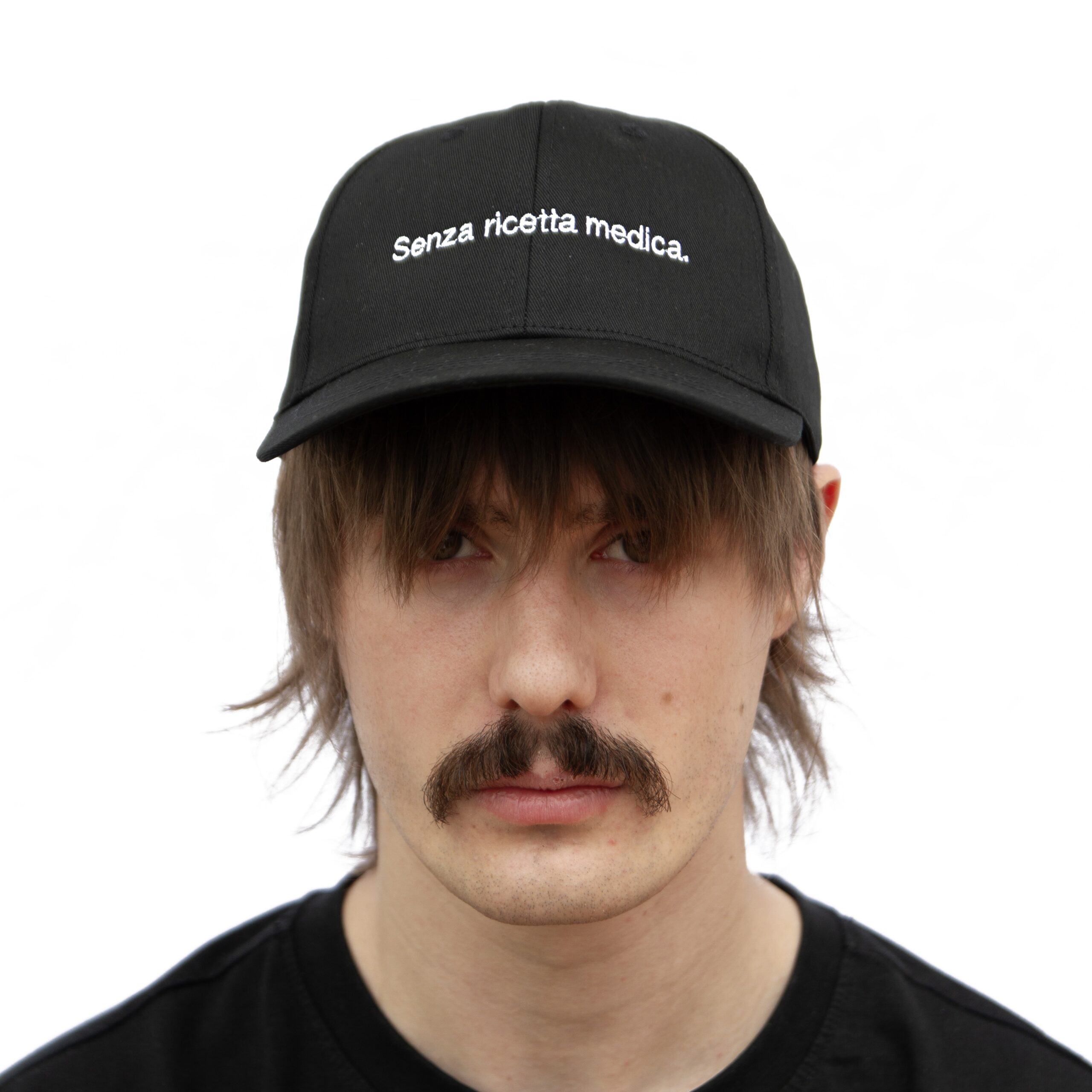 Cappellino baseball a 6 pannelli, chiusura con cinturino e velcro, taglia unica. Colore nero con ricamo sul fronte e sul retro in bianco. Composizione: 35% cotone, 65% poliestere.